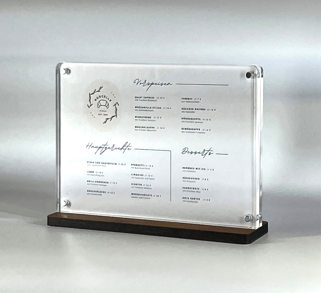 Von großer Menübeschilderung für die Wand bis hin zu gravierten Menükarten finden Sie bei uns alles, was Sie für Ihr Lokal benötigen.